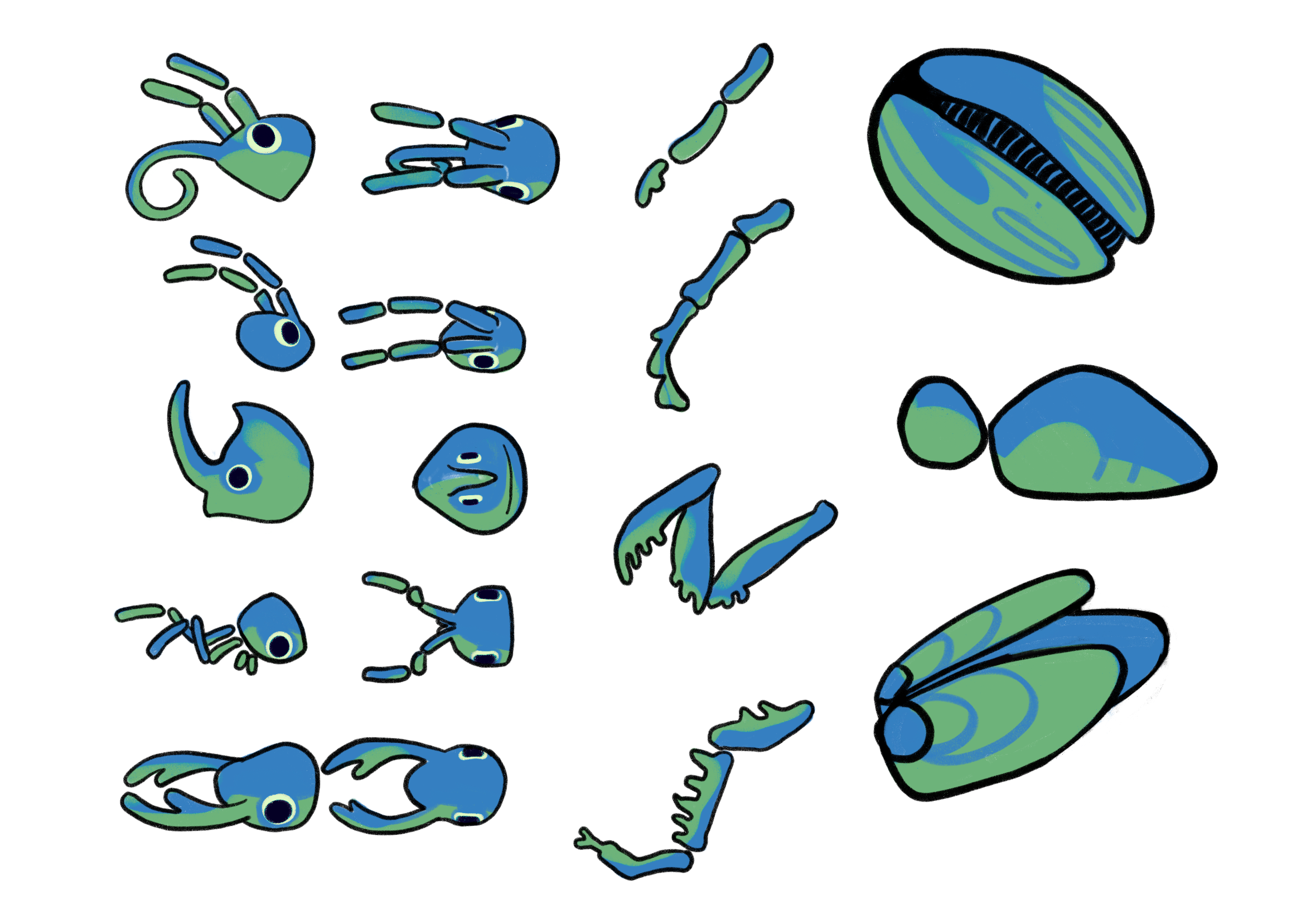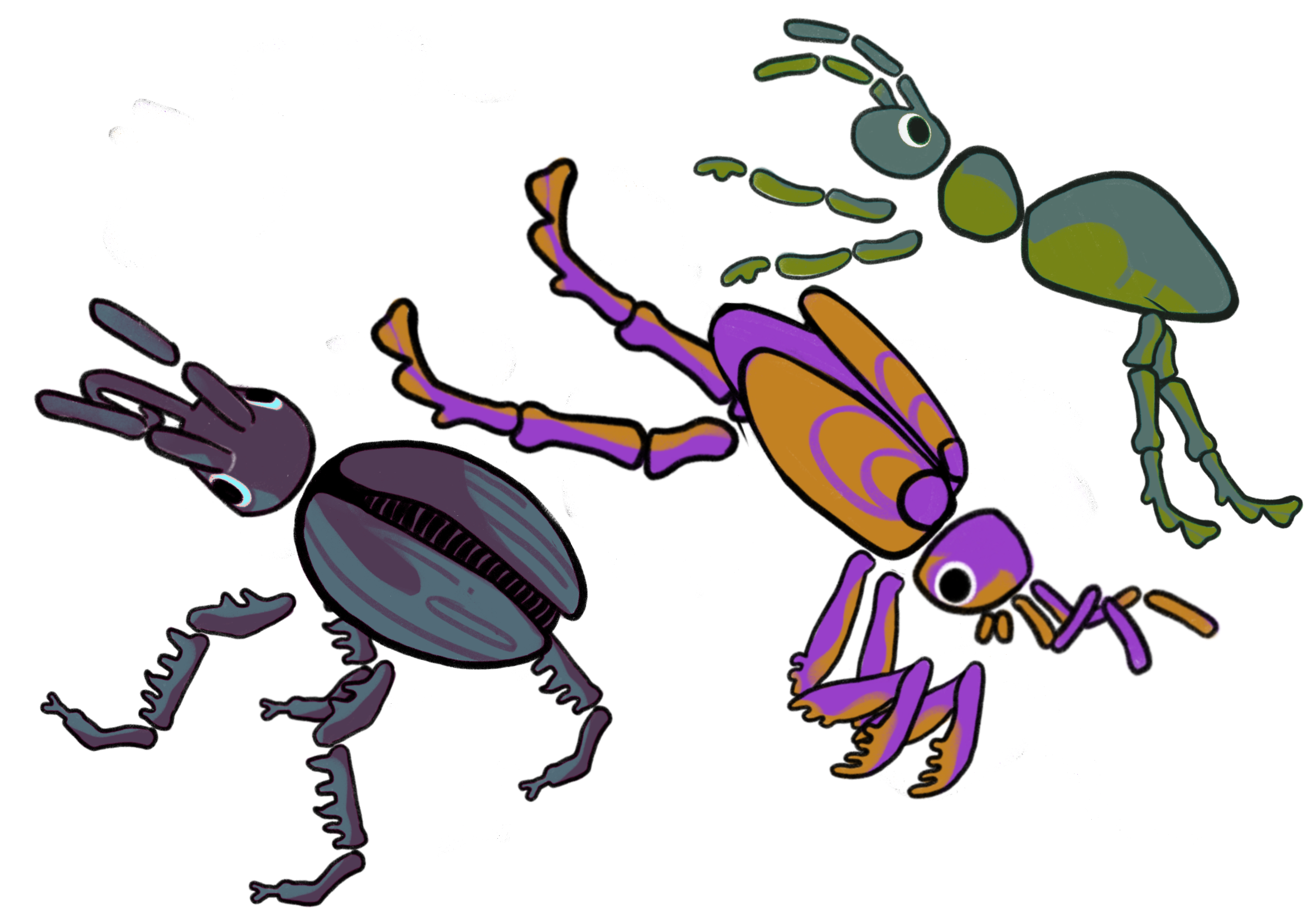 ✦ Modeled and textured low-poly beetle, ant, and grasshopper rigs with interchangeable modular parts and customizable texture support.
