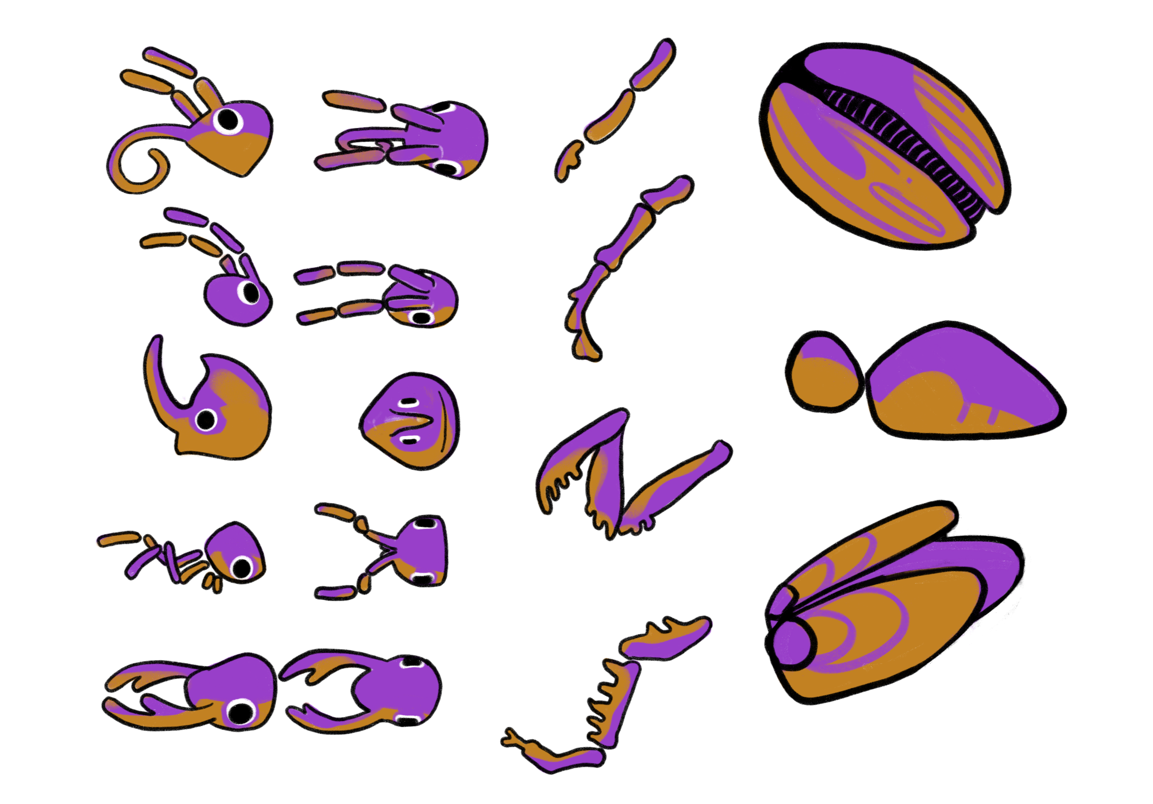 - Modeled and textured low-poly beetle, ant, and grasshopper rigs with interchangeable modular parts and customizable texture support using Adobe Substance Painter and Maya.