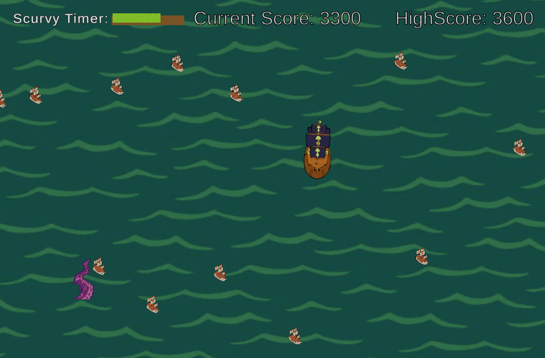 Overview: Kiwi Captain is a casual action game where players helm a Kiwi Pirate ship, plundering enemy Chicken Ships for kiwi fruit before succumbing to scurvy on the open seas. Originally scoped as a cooking game, the project underwent a full design pivot mid-development, requiring a rapid redesign of core mechanics, scope, and deliverables under a 5-week deadline.Key Features: Casual Action Gameplay · Player Ship Movement & Collision · Scurvy Loss Condition · Original Sprite Art · Full Mid-Development Design Pivot